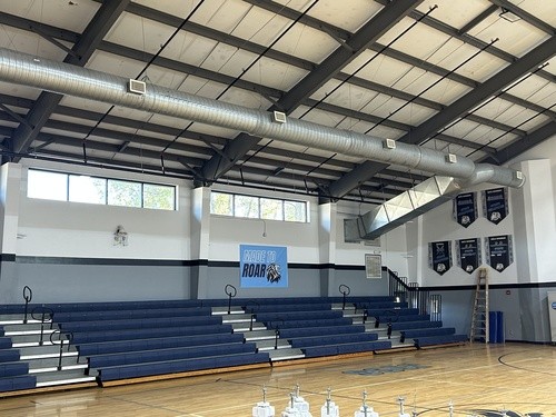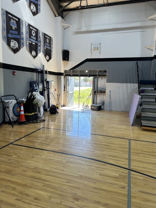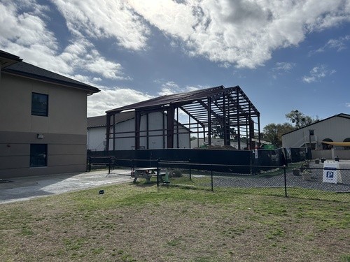 3/6/2026 - We are vertical! What an exciting week. We are now seeing the new building structure rise up from the slab. The first corner post was placed on Tuesday. The remainder of the exterior wall supports have been installed along with roof support structure. The building footprint is visible across campus! Inside the gym, the crews are busy installing a new double door at the corner of the gym, installing new lights to make the space much brighter, rearranging the HVAC duct work on the playground side of the gym, and installing the sprinkler system. It is amazing to see the building coming together.
